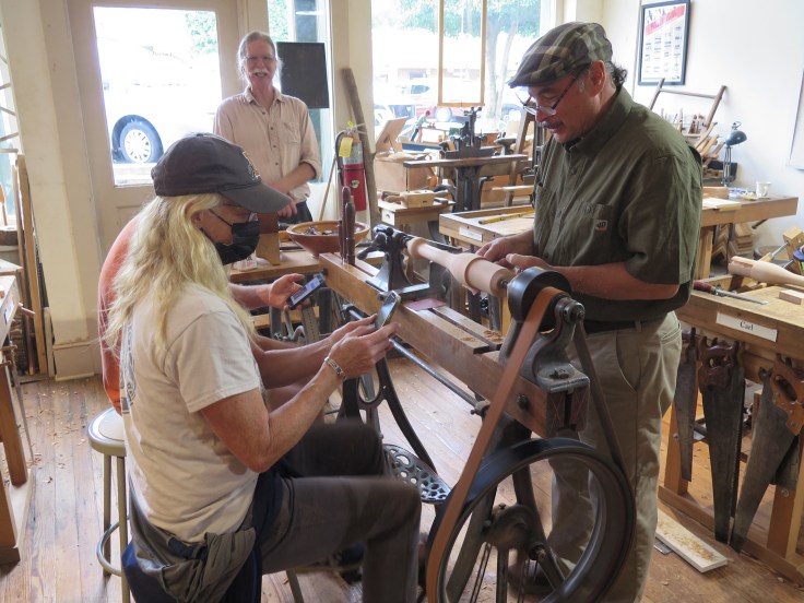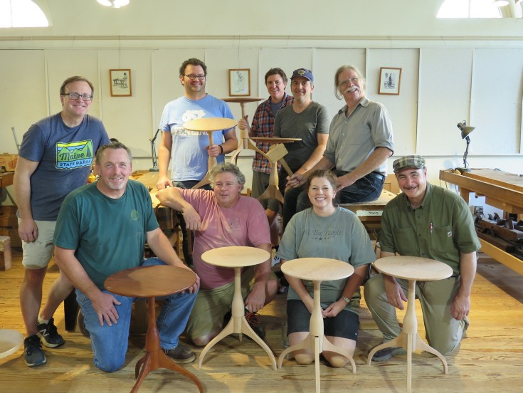 This past weekend I taught the second Shaker candle stand class this year at The Woodwright’s School in Pittsboro, NC (forgot my camera on the first one!). I have done this class at other schools over the years but with electric lathes. At Roy’s we use a treadle lathe in keeping with the hand tool only spirit. I was apprehensive about this being I can hardly walk and chew chewing gum at the same time much less peddle and try to spindle turn. It it has worked out well with the meat powered lathe though.